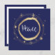 Divulgue a mensagem de paz nesta época de festas. Design moderno e lindo de estrela dourada cerca a palavra Paz. Fundo azul. Adicione sua mensagem pessoal. Cartão perfeito para enviar a familiares e amigos para que saibam que você está pensando neles durante as festas.