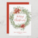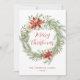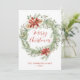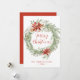 Cartão floral elegante de Natal, com "Feliz Natal" num guião vermelho rodeado por uma coroa de poinsetos vermelhos, rosas de natas, boughs de pinheiros, bagas sagradas e outros verdes de inverno. Personalize a frente do cartão de Natal não fotográfico com o seu nome de família e o ano que aparece abaixo em letras vermelhas. A parte de trás do cartão de feriado rústico contém sua mensagem pessoal em letras brancas.