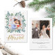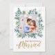 Um modelo de cartão de Natal moderno e romântico para o primeiro Natal de casamento, com um tema de folhagem de inverno, apresentando uma moldura botânica quadrada caprichosa de galhos de pinheiro, eucalipto prateado e galhos de mirto dourados (este é um efeito digital) sobre o modelo de foto na frente e folha dourada sobre a palavra "casados" (este é um efeito digital, não folha real). Modelo para uma segunda foto de casamento no verso. Um cartão de Natal e festas perfeito para recém-casados, elegante e sofisticado.