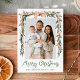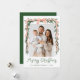 Celebre a temporada em estilo com este elegante cartão com fotos de feriado com um arco de fita vermelho e branco festivo, listrado, emparelhado com a garland de pinheiro d'água. Uma foto da família favorita é enquadrada na frente com "Feliz Natal" em um roteiro branco verde e seu nome abaixo, enquanto o verso inclui espaço para três fotos adicionais e uma pequena mensagem personalizada. Uma mistura eterno de verde festivo e charme clássico de férias, esta design é uma bela maneira de partilhar os cartões de natal da sua família.