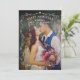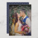 Este design de cartão com fotos mostrado para um novo casal apresenta uma foto retrato do dia do casamento com um design de sobreposição de texto personalizado na moda branco e um quadro de rolagem. A parte traseira da placa apresenta um marinho profundo / cor azul-da-meia-noite de fundo que pode ser modificado com um padrão de seta branca.