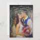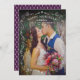 Este design de cartão com fotos mostrado para um novo casal apresenta uma foto retrato do dia do casamento com um design de sobreposição de texto personalizado na moda branco e um quadro de rolagem. A parte traseira da placa apresenta uma cor de fundo roxa profunda que pode ser modificada com um padrão de seta branca.