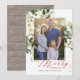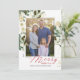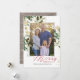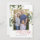 Esta elegante carta de Feliz Natal apresenta uma ilustração de estilos de aquarela de flores e galhos de pinheiro com traços de falso brilho. Uma foto de família está no centro. Esta design tem uma aparência rústica, mas moderna, e é perfeito enviar desejos de férias a parentes e amigos.