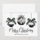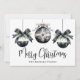 Envie votos calorosos de férias com este cartão de Natal elegante e plano, apresentando um design minimalista na frente com três enfeites em aquarela preta e branca, acentuados por folhagens verde-escuras e detalhes de laço doce. "Feliz Natal" é escrito em tipografia cursiva graciosa, com o nome da sua família exibido abaixo em uma fonte serifada clássica para um toque personalizado. Você pode atualizar facilmente a saudação para "Boas Festas" ou "Saudações de Fim de Ano" se preferir.