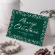 Cartão de Natal elegante com "Feliz Natal" exibido na frente em um roteiro de caligrafia branco e ousado com floco de neve branco e borda de pínus em um fundo verde. Personalize a frente do cartão de feriado que não seja fotográfico adicionando seu nome e o ano. O dentro da placa fornece espaço para sua mensagem pessoal digitada ou manuscrita. A parte de trás do cartão de feriado moderno apresenta um lindo padrão de flocos de neve.