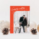 Cartão de feriado mínimo e caprichoso para os recém-casados celebrando seu primeiro Natal juntos como marido e mulher apresentando um texto que diz "Sob o Mistério para sempre" em cima de sua foto com um canto curvo. O fundo é vermelho.
