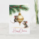 Dois camundongos brincam com um Enfeites de natal decorativo pendurado em um galho de abeto adornado com frutas vermelhas. Todo o texto pode ser alterado.