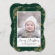 Enviar cartões de natal personalizáveis e personalizados a amigos, colegas e familiares em cartões com fotos simples, minimalistas, elegantes, divertidos, festivos e modernos! Um belo quadro de variedade de flocos de neve de inverno dourados em fundo verde sábio rodeia sua foto em papel colchete. A saudação "Feliz Natal" está escrita em caligrafia elegante, e abaixo apresenta sua mensagem de saudação personalizada do nome da sua família na tipografia moderna. Inverta para revelar um belo floco de neve de inverno de ouro de cheio sobre fundo de padrão verde de sábio.