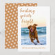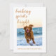 Cartão de Natal com tema de cachorro festivo com o texto "espíritos latindo brilhantes" em caligrafia elegante e seus votos de Natal em tipografia moderna e elegante. Basta adicionar seu texto e enviar sua foto favorita de seu cachorro. O verso do cartão tem um padrão de flocos de neve em fundo ocre dourado. Exclusivamente projetado para você pelo Happy Dolphin Studio. Se precisar de ajuda ou produtos combinando, entre em contato conosco em happydolphinstudio@outlook.com.