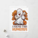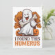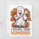 Camiseta engraçada de Halloween com um fantasma alegre segurando um grande osso entre duas abóboras esculpidas com árvores de outono ao fundo. O texto abaixo diz "EU ENCONTREI ISSO HUMORÍSTICO", incorporando um trocadilho humorístico.