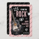 Cartão de valentines para crianças legais! O design apresenta um violão elétrico, o texto 'Eu acho que você é demais' decorado com ilustrações de giz de coraçãozinho.
