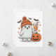 Um fantasma fofo vestindo um chapéu laranja segura uma bebida enquanto está ao lado de uma abóbora sorridente. Morcegos voam acima, e estrelas cintilantes adicionam um toque festivo.