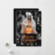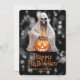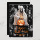 Feliz cartão de Halloween com um fantasma assustador com um jack o’lantern contra um fundo noturno estrelado. Personalize facilmente este cartão de Dia das Bruxas com seu nome e texto de família.