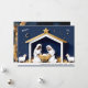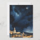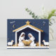 Por favor, note que não é usada nenhuma papelada nesta design. O cartão é impresso plano, mas tem um efeito falso 3D, com uma aparência semelhante à da papelada no trabalho de arte. Esta bela e serena e moderna carta natalícia, apresenta a Santa Família sob uma brilhante Estrela ouro de Belém. Este elegante design retrata a cena do primeiro Natal com um talento minimalista e contemporâneo. O fundo azul de índio profundo é lindamente contrastado com as túnica branca brilhante de Maria e José e os sotaques ouros da mangueira e do telhado estável. Os sentimentos de "paz" e "alegria" entre as estrelas complementam esta imagem tranquila. Na parte de trás está um dramático céu noturno atmosférico sobre a cidade de Belém, em um estilo aquarela, completo com um respirador brilhante, complementando perfeitamente a pacífica design. Ideal para aqueles que buscam um cartão temático cristão, ou um design não-fotográfico, e para aqueles que apreciam uma tomada moderna e minimalista sobre um tema tradicional. Clique em "Personalizar" e edite o nome da família e o ano na parte inferior da placa para seu próprio nome.