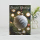 Cartão de Natal Elegante com uma foto de perto de um ornamento de bola de golfe pendurado nos galhos de uma árvore de Natal. Textos de cartão totalmente personalizáveis. Precisa de ajuda? Entre em contato conosco para obter ajuda para personalizar ou personalizar. Feliz feriado!