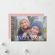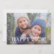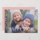 O cartão com fotos de feriado moderno de ano novo apresenta a sua foto horizontal favorita com a cobertura de texto "Happy 2024!" design com texto personalizado e borda de formatos de confetti. Personalize com uma mensagem personalizada e seus nomes ou nome da família. A parte traseira da placa apresenta uma cor de fundo rosa dourada / rosa impressa (pode ser modificada) com o padrão de configuração de coordenação.