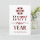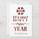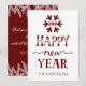 Elegante, ornamentada tipografia Feliz Ano Novo vermelha e branca, floco de neve, pinheiro e pinhas! Use a ferramenta Personalizar para adicionar seu texto, ano de celebração, nome da família.