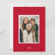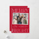 Cartão com fotos de feriado moderno com sua foto horizontal em um quadro fotográfico branco instantâneo. A expressão "Feliz e Brilho" é apresentada em letras brancas com um fundo vermelho festivo. Personalize a frente do cartão de feriado de snapshot com sua saudação personalizada, seu nome de família e seu ano. A placa se reverte para uma foto adicional e um fundo vermelho com sutis pontos brancos (neve).