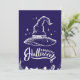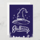 Este impressionante cartão de Natal de Halloween apresenta uma ilustração branca e ousada de um chapéu clássico de bruxa contra um fundo roxo profundo. O design é completado com uma cena assustadora de cemitério na parte inferior, adicionando um toque sinistro e elegante. A mensagem "Feliz Halloween" é elegantemente escrita, tornando este cartão de Natal perfeito para enviar saudações de Halloween ou para uso como peça decorativa durante a temporada assustadora. O design minimalista e impactante é ideal para aqueles que apreciam uma estética clássica de Halloween.