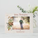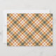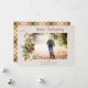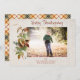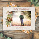 Design de colheita rústica e colorida, com modelo de foto de solteiro em fundo de canvas de tecido rústico com spray de ouro, laranja e vermelho, folhas e bagas de outono, com saudação de Feliz Ação de Graças em roteiro de caligrafia personalizado e campos de texto editáveis. A parte traseira apresenta um padrão tartano complementar em coordenação das cores de queda.