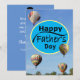 A frente do cartão apresenta fotografia de balão de ar e diz, "Feliz Dia dos Pais" A parte de trás do cartão tem fundo azul e texto branco que diz, "Saber que você está lá para mim, me levanta e melhora meu humor. Obrigada, Pai! Com Amor, Jen." Personalize com o seu nome.