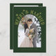 Cartão de férias mínimo e elegante para os recém-casados celebrando seu primeiro Natal juntos como marido e mulher apresentando um texto que diz "FELIZ & CASADO" no topo da fotografia feita. O fundo é verde.