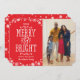 O Cartões de foto de Natal temático "Feliz e Brilho" apresenta uma foto retrato, cor vermelha de fundo (que pode ser personalizada para corresponder à sua foto), quadro de estrelas brancas e flocos de neve e padrão de neve de inverno na parte traseira da placa.