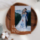Cartão de férias mínimo e elegante para os recém-casados celebrando seu primeiro Natal juntos como marido e mulher apresentando um texto que diz "Feliz e casado" em cima de sua foto com um canto curvo. O fundo é verde sábio.
