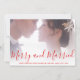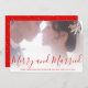 Envie alegria de feriado como um novo casal com este cartão de Natal plano apresentando um design moderno e simples com a mensagem "Feliz e casado" em um elegante texto vermelho sobre sua foto favorita. A parte de trás é vermelha com um padrão de queda de neve.