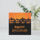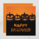 O cartão mostra quatro abóboras entalhadas seguidas e "Feliz Dia das Bruxas" em grunhido e angustiado, abaixo. O fundo é laranja e os outros elementos são negros. As costas repetem "Feliz Dia das Bruxas" e mostram duas abóboras. Há espaço para escrever abaixo da saudação. Engraçado, divertido, legal e assustador.