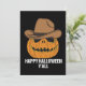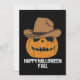 Feliz Dia das Bruxas, com um chapéu engraçado de vaqueiro em uma abóbora. País do Sul a sorrir o cartão de humor do Dia das Bruxas Jack O'Lantern para um yall texano. Design de bombeiros fofinhos bonitos do Texas para os nossos amigos do Sul. Louco, mas adorável jack ou lanterna.