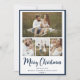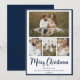 Este belo cartão de Natal de colagem de fotos com 4 fotos, Feliz Natal em uma fonte moderna de escrita de pincel, um sentimento personalizável, seus nomes e o ano seriam perfeitos para enviar para seus amigos e família. Todos adorarão tirar novas fotos da sua linda família. As fontes são modernas e limpas em azul marinho.