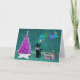 Este cartão de saudação de Natal tem um gato preto giro com um arco cor-de-rosa próximo a uma árvore de Natal rosa e prateada num tapete em forma de estrela branca com um monte de presentes embrulhados numa sala cor de chá. Personalize o verso dentro e o nome com os modelos.