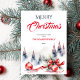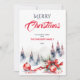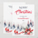Feliz Natal clássico tradicional enfeites vermelhos e fita vermelha árvores de abeto nevadas modelo de convite para download instantâneo aquarela