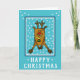 Cartão de Férias Feliz de Natal, Padrões de Estrelas Engraçadas. Veado engraçado bonito com nariz vermelho e uma campainha no pescoço sobre um fundo azul com estrelas brancas.