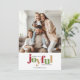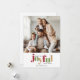 Este simples cartão de Natal, com duas fotografias, apresenta a palavra "alegre" num estilo lúdico e aparece em letras vermelhas, verdes e douradas. O design oferece espaço para duas fotos, uma na frente e outra atrás.