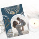 Este belo cartão de Natal apresenta uma vibrante impressão azul com formas geométricas circulares e uma fotografia moderna em forma de arco. A parte traseira apresenta uma mensagem pessoal editável em um fundo branco.