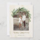 Este elegante design de cartão de feriado apresenta um quadro de arco único para a sua foto com pinheiros vergreens de feriado, eucalipto verde e luzes de fadas de cordas em cascata para destacar sua foto. Inclui o texto de cor de bronze "Feliz Natal" com uma redação que pode ser personalizada e um fundo de cor de marfim neutro e de cor de água creme.