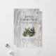 Cartão de férias com aquarelas, com uma cabana de madeira no bosque contra um fundo de madeira rústica, decorado com flocos de neve. Personalize facilmente este cartão de feriado com o seu nome e texto de família.