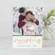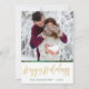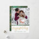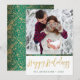 Envie um feliz Natal a alguém com este cartão único. A frente tem um espaço para você adicionar seu nome e o ano, e adicionar sua própria foto. Feliz Natal é escrito em uma fonte de letra desenhada à mão, e coberto com uma textura de folha dourada. A parte de trás tem uma bela textura de folha dourada e um padrão profundo verde desenhado à mão de espirais, pontos e flores.