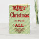 Esta design de carta de boas-vindas festiva contém as palavras "Feliz Natal a Todos" em letras vermelhas brilhantes com várias fontes e florescimento. No fundo, tem uma amêndoa maior florescente com folhas verdes e pequenas bagas vermelhas. Tudo isso se baseia em um fundo listrado verde claro feito para parecer descolorado e espetado de uma maneira antiga/vintage. A dentro tem uma safra, vestida colorida com mais manchas brancas que parecem cair neve. Ele também tem espaço para você adicionar sua mensagem pessoal — ou simplesmente excluir o texto de amostra para deixá-lo vazio. Você também pode clicar em "Personalizar" para obter mais recursos — como adicionar sua própria foto ao lado dentro à esquerda. Este é um cartão simples, elegante e antiquado para a época de férias do Natal. Consulte itens correspondentes em nossa loja.