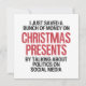 Engraçado design de Natal político em textos simples, vermelhos e negros e a frase humorística "Acabei de economizar muito dinheiro nos presentes de Natal falando sobre política nas redes sociais." Este hilário comentário social design de Natal faz um belo presente para quem gosta de política e de redes sociais.