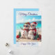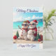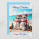 Um cartão de Natal caprichoso com dois bonecos de neve alegres em uma praia ensolarada. Um usa um chapéu do Papai Noel e óculos de sol, enquanto o outro ostenta acessórios festivos. Eles sentam lado a lado, cercados por pequenas árvores de Natal e enfeites, com uma caixa de presente.