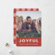 Esta saudação de fotos de Natal rústica apresenta um grande tipo de alegria em um fundo vermelho festivo. Há um impressão de floco de neve de inverno na parte de trás deste cartão de tendências.