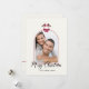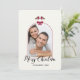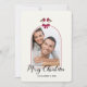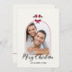 Layout simples, doce e moderno. Ideal para recém-casados ou primeiro Natal do casal. O design inclui uma moldura de foto arqueada com um pequeno laço vermelho e um par de robins. Personalize a frente com sua própria foto e edite facilmente os nomes e o ano. No verso, você encontrará um laço simples.