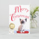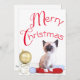 Este cartão de Natal plano apresenta um adorável gatinho siamês que fica de pé sobre os Papais noeis numa mesa de estrelas douradas e um ornamento dourado. A tipografia vermelha "Feliz Natal" fica acima da design. Personalize as saudações de retorno nos campos de texto, remova ou todo o texto de modelo para deixar espaço para uma nota manuscrita ou clique em personalizar para selecionar um estilo de fonte, tamanho e cor desejados.
