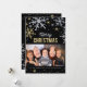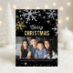O design de carta de saudação de fotos festivas de feriado apresenta flocos de neve prateados e dourados cintilantes e texto de "Feliz Natal" com texto personalizado e uma imagem que pode ser personalizada. A borda e o script do floco de neve de férias têm uma aparência brilhante texturizada em um fundo preto.
