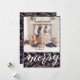 Envie cartões de natal personalizáveis e personalizados a amigos, colegas e familiares em cartões de estilo simples, chic, elegantes e modernos de design fotofestivo, minimalista natural! Uma bela caligrafia de quadros de "feliz" na parte inferior da sua foto na frente. Abaixo, a caligrafia apresenta sua mensagem de saudação personalizada do nome da sua família na tipografia moderna. Inverter para revelar um belo ouro árvore de natal soprando em fundo azul marinho escuro.