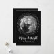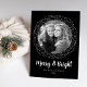 Cartão festivo preto de férias com a sua fotografia rodeada de uma armação branca pontilhada em círculo. "Feliz e Brilho" é exibido em um script manuscrito branco em negrito com seu nome e o ano mostrado abaixo. A placa se reverte para um padrão pontilhado branco com um fundo preto.