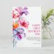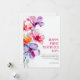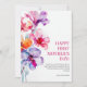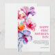 Cartão de Dia das Mães com Flores Florais Elegantes apresenta uma impressionante arranjo floral em aquarela em tons de rosa, roxo e laranja, adicionando um toque vibrante e elegante. A frente inclui a mensagem "FELIZ PRIMEIRO DIA DAS MÃES!" em uma fonte sofisticada, acompanhada de uma nota doce e encorajadora sobre a jornada da maternidade.